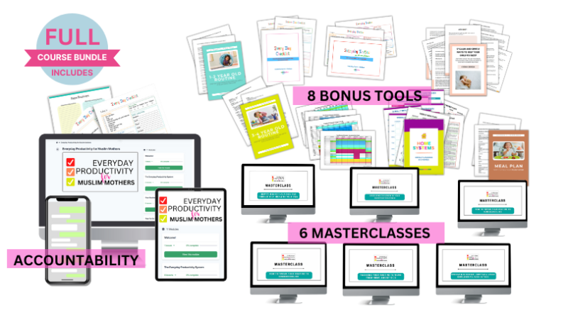 Everyday Productivity for Muslim Mothers is a time-management course designed to help you fix your routine, beat overwhelm and find balance.